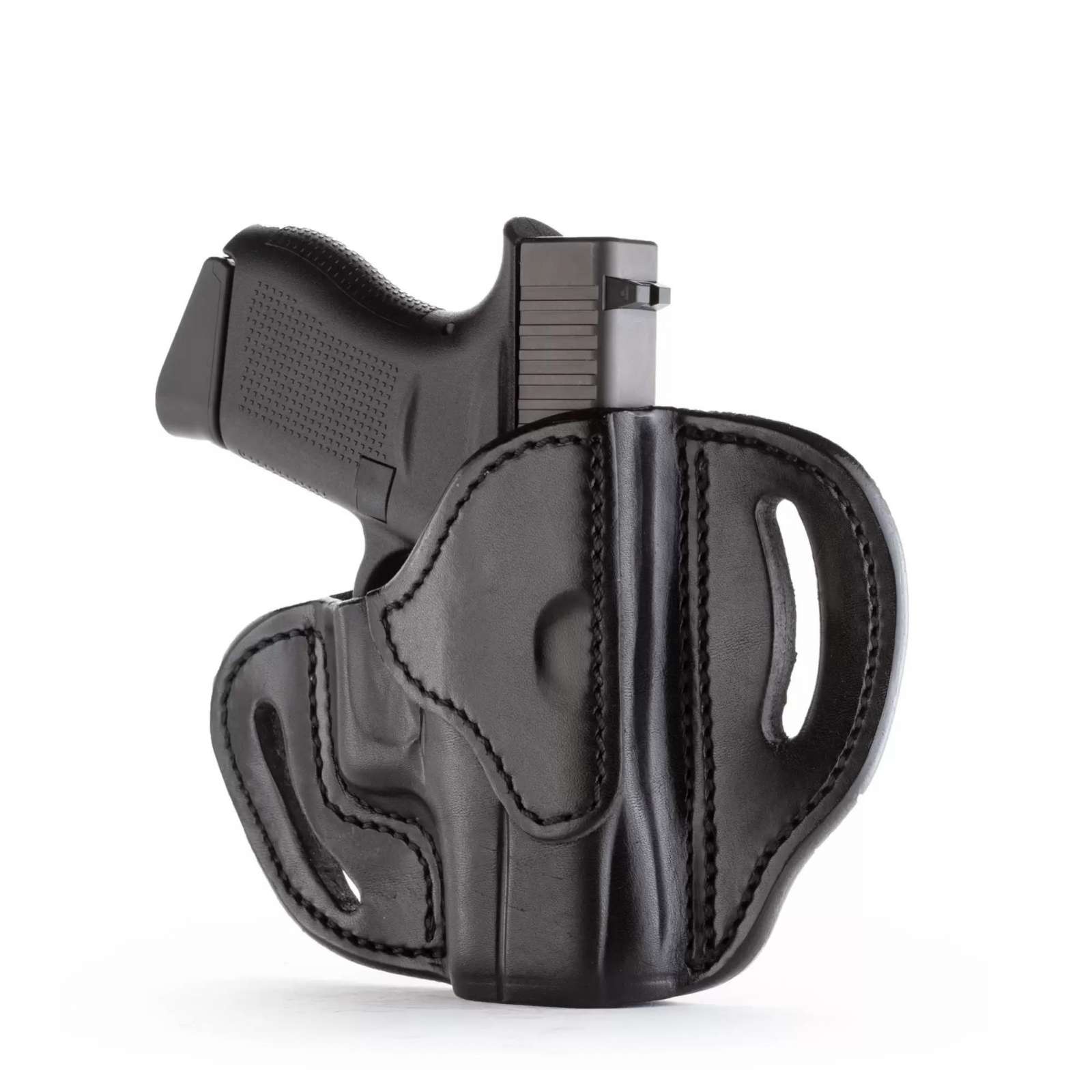 This Open Top Belt Holster Compact is designed to support the Glock 43. The Belt Holster Compact offers retention for comfortable and reliable all-day carrying. Features and open top design for quick draw, multi-fit design with reinforced stitching that's handcrafted to accommodate a wide range of firearms. Includes a strong beveled steel clip for comfort and the safest retention.