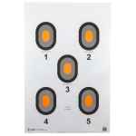 This target features 5 bull's-eye targets. The targets features the colors gray and black with a bright orange center. It has dimensions of 23" x 35".