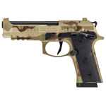 The Beretta 92XI Combat Series pays homage to the heritage of military camouflage patterns, recognizing the vital role these patterns play in enhancing soldier concealment and mission success. Each pistol in this exclusive collection is meticulously hand-painted by a disabled veteran artist. Featuring iconic American combat camouflage patterns, each piece represents a story of sacrifice and service. The 92XI Combat series features the 92XI Single-Action Only (SAO) pistols. The 92XI brings the long-awaited frame mounted safety to the standard 92 family of products, as well as a single action only variant and various ergonomic enhancements. The frame mounted safety offers an ambidextrous solution, bringing the safety lever more in reach with natural ergonomics. The 92XI features the X-treme-S single action only and flat faced trigger, performance DLC coated trigger components and a lightweight skeletonized hammer, allowing for a crisp trigger pull with the option to go cocked and locked. The 92XI carries forward the Vertec style frame, a fiber optic front sight for faster sight acquisition, and the option for MRDS optics mounting making this a high performing, reliable choice for personal defense and competition.