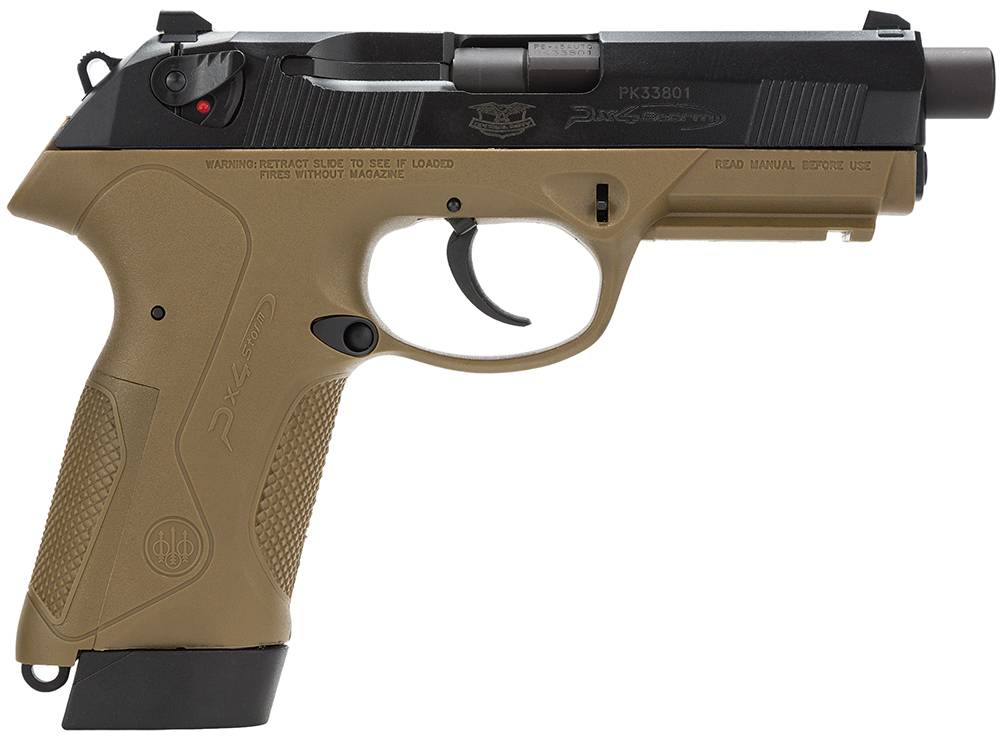 The PX4 Storm SD (Special Duty) was developed to meet the very demanding requirements of the original 45 caliber JCP (Joint Combat Pistol) specifications issued by SOCOM. It utilizes state-of-the-art materials and finishes for superior weather resistance capable of withstanding the toughest weather and military conditions. The manual lever safety and slide stop lever are both ambidextrous while the magazine release button is reversible. The SD features a distinctive dark earth-colored fiberglass-reinforced polymer frame with a Mil Std-1913 Picatinny rail and matching interchangeable backstraps for a custom fit. The Px4 SD features locked breech action with a rotating barrel system, reducing felt recoil and muzzle rise. Its extended, chrome-lined barrel provides extreme corrosion resistance and features a deeply recessed combat muzzle crown to protect the rifling. The PX4 Storm SD comes with three magazines, a 9-round flush fit and two 10-round extended, all with a special PVD corrosion-resistant, high lubricity finish. This model comes with a threaded barrel and a heavy-duty custom-fitted waterproof case with a FDE finish.