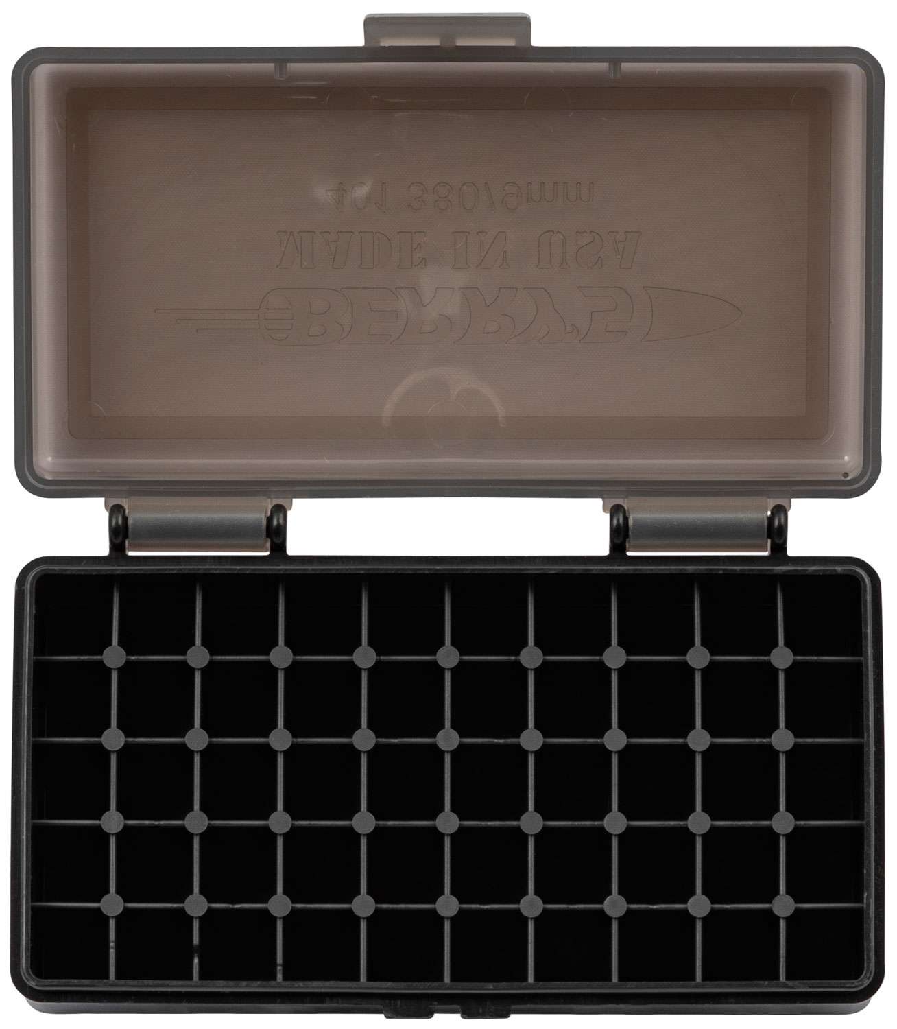 Made in the USA, Berry's 401 50 round box is made from high impact polypropylene for increased strength against cracking, chipping, warping, expansion, or contraction. The box is stack able and features a stronger, flip-top design, allowing the securing of ammo storage with easy one-handed operation.