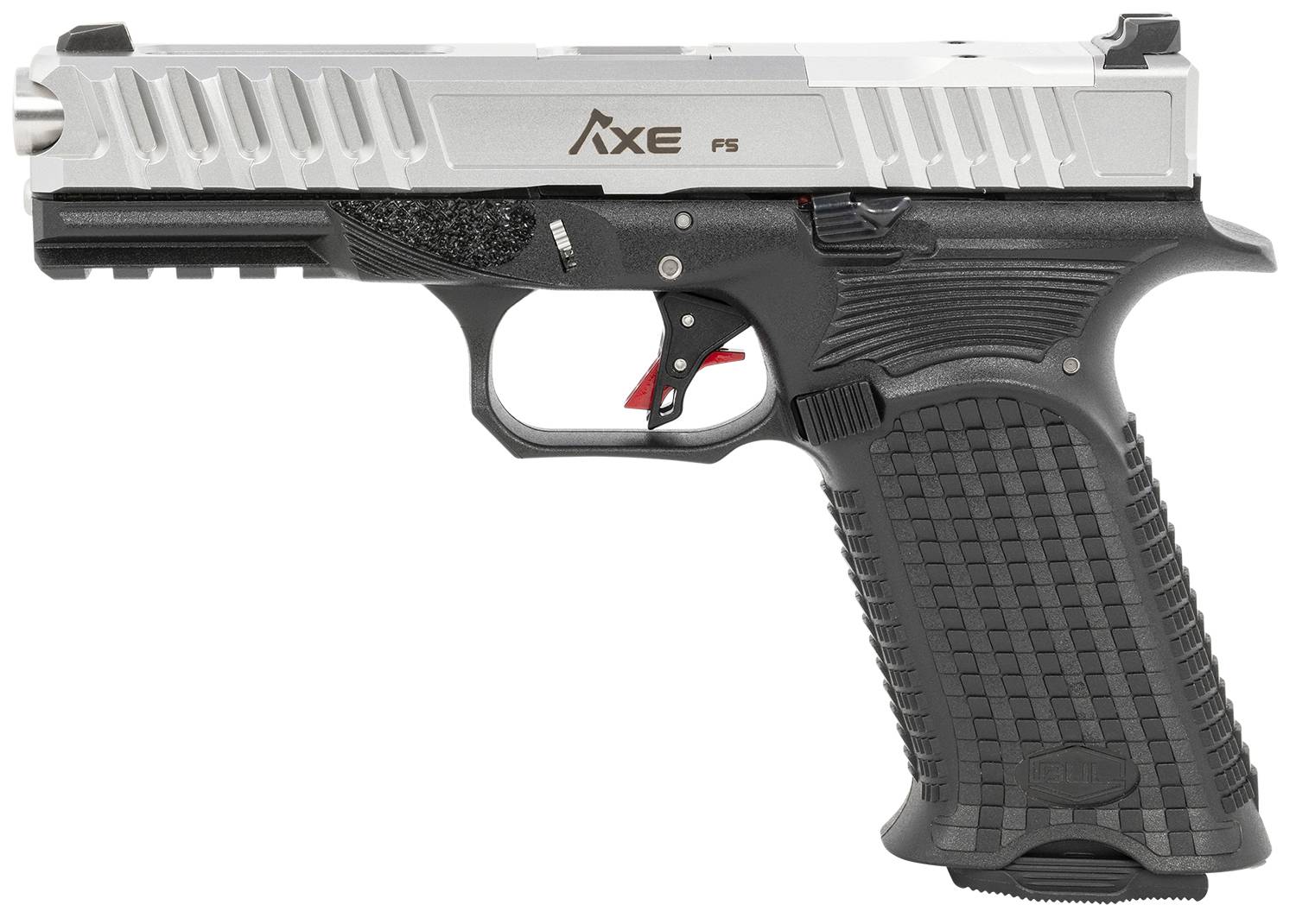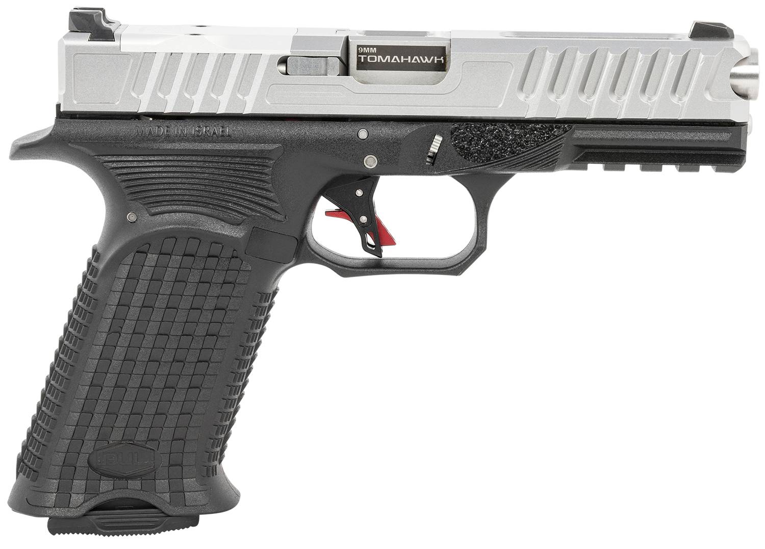 The Tomahawk features slide serrations with a weight reduction cut, steel 3-Dot sights Glock dovetail, optic ready w/Trijicon RMR footprint, fluted barrel, integrated flared magwell with side cuts, high grip beavertail, trigger guard with a high double undercut, reversible magazine release, extended slide lock lever, ambidextrous integrated thumb rest, flat face trigger shoe, 1913 Picatinny rail, stainless steel guide rod and dimpled stainless steel pin kit. Includes 3 Magazines, fabric range bag, owner's manual, safety flag and Bore brush kit.