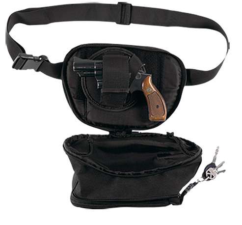 The Fanny Pack Pistol Holster by Bulldog is an ambidextrous universal holster with a full-length zipper and nylon wrap-around carry straps. This model is made with heavy-duty Nylon, and the outer shell is water-resistant. There is 1.75"-thick soft padding.