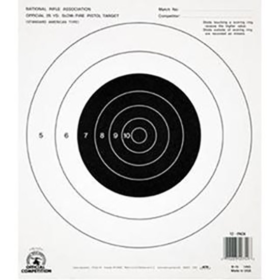 Dimensions of this target are one-half the dimensions of the B-6 50 yard Slow Fire pistol target. Slow fire scores on this target closely approximate the average slow fire scores at 50 yards. No sight adjustment is necessary to change from this target it the B-8 25 yard Timed & Rapid Fire target. 7-8-9-10 rings black - Size: 10.5 x 12 paper