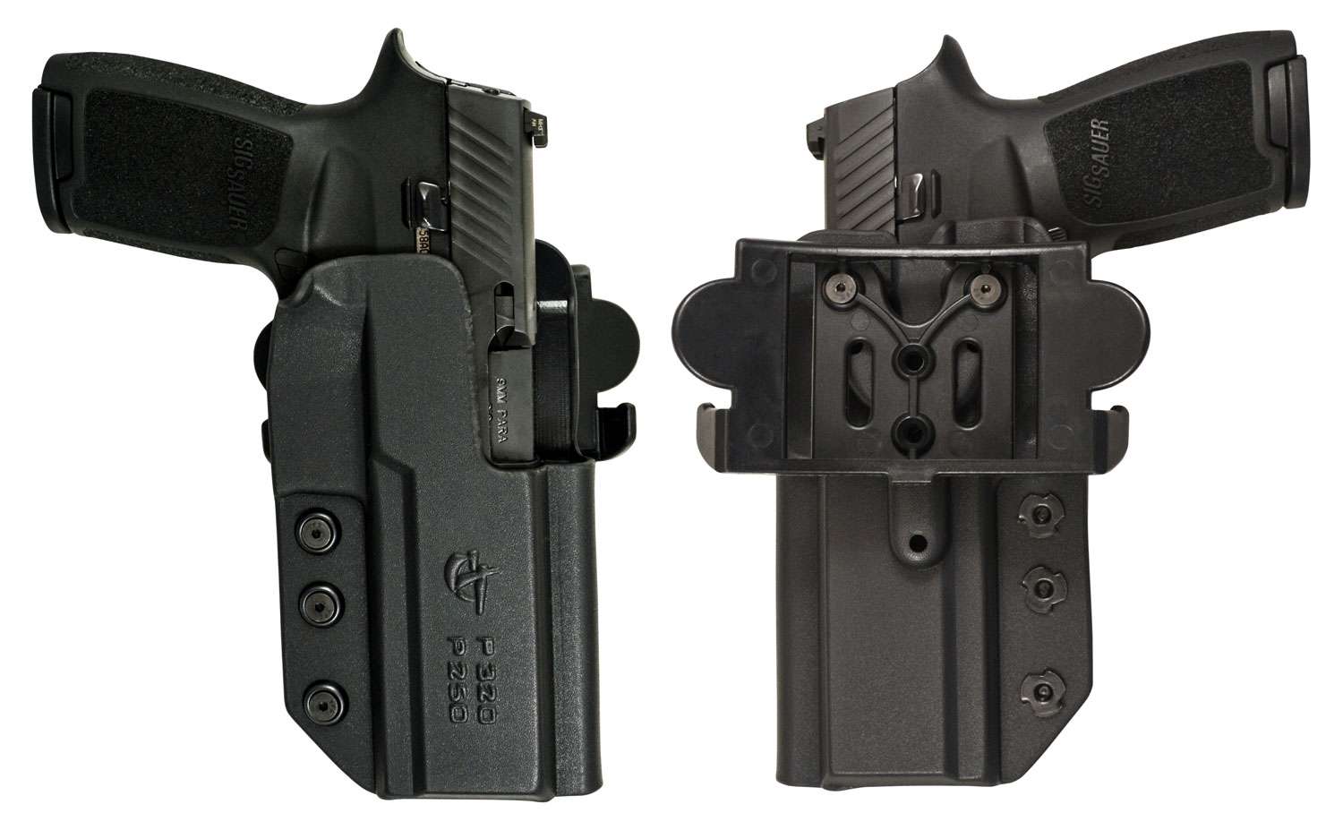 The International is an outside the waistband (OWB) holster ideal for competition shooting, concealed carry or general use. It is cut down in the front to fit most optic sight and has a .5" tall sight rail to fit most suppressor/optic co-witnessing sights. The all-Kydex body provides a rigid material that is custom fit to each firearm and maintains its shape even with the pistol un-holstered. The smooth, low friction surface allows for a fast draw and easy one-handed re-holstering of the firearm. With a modular mounting design giving the user 16 holster options in 1. The International includes belt mount, paddle mount and drop offset piece options. It's cant adjustable, belt width adjustable 1.5" - 2" and retention adjustable. Note-Once the adjustment tab has been removed it cannot be reattached.This model is compatible with SIG P320/RX/250 Compact.