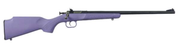 Crickett's Crickett Synthetic Rifle has a manual cocking single-shot bolt action. It features a rebounding firing pin safety, adjustable rear peep sight and a fixed front, synthetic stock, and a drilled and tapped receiver. This model has a blued barrel and a purple synthetic stock.
