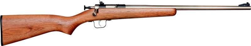 Crickett rifles are the staple of the youth shooting experience. A manual cocking, single-shot, bolt action, it features a rebounding firing pin safety to prevent accidental discharge, 2.5-3 lb. trigger pull, 11.5" length of pull, and a 16.125" barrel. Crickett rifles have a fixed front sight, adjustable rear peep sight and are drilled and tapped to accept Crickett scope mounts. This model has an American Walnut stock with a stainless steel barrel.
