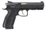 CZ's SP-01 AccuShadow by the CZ Custom Shop has become a standard for any competive shooter. It features a higher beavertail, undercut trigger guard, and contoured slide. The Shadow 2 model has a interchangeable magazine release with an adjustable, extended button with three settings and an ambidextrous safety. A hardy nitride coating covers the entire pistol, while the frame gets an additional layer of CZ's black Polycoat finish. Its blue aluminum grips has checkering to match the front and backstrap checkering. The slide also has a front fiber optic with a black HAJO rear. It also features a 1911 style AccuBushing, making it capable of sub-3" groups at 50 yards, almost unheard of for a pistol. A custom hammer also further lightens and smooths the DA and SA pulls, while the reset is shortened with a hand-fit disconnector.