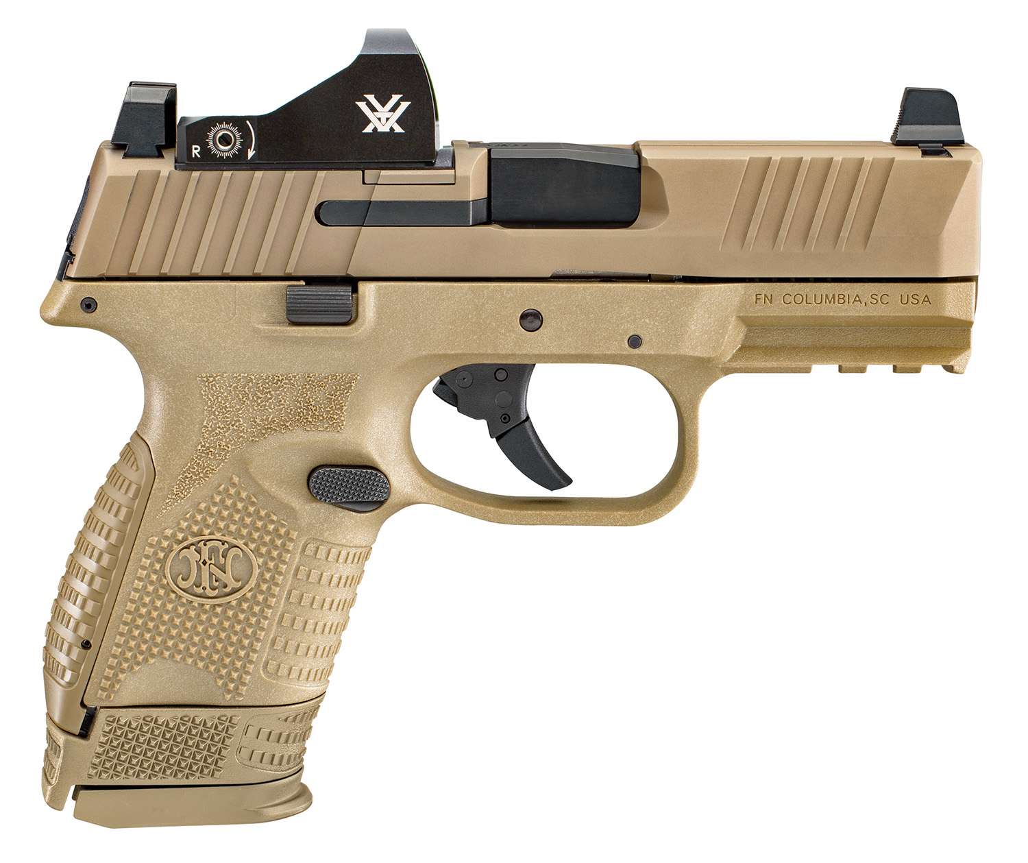 With the patented Low-Profile Optics Mounting System and unparalleled modularity of the FN 509 platform, the FN 509 Compact MRD joins the ranks packing a full-size punch in a compact, optics-ready package. The pistol is 9mm and striker-fired with 3.7" barrel, standard 10+1 capacity and the capability to accept all higher capacity FN 509 magazines. The patented FN Low-Profile Optics Mounting System accepts nearly all commercially available miniature red dot optics and features blackout iron sights that co-witness. The improved controls aid in manipulation, the new improved texturing on the two included backstraps provides better recoil management and a new flatter faced trigger allows for more controllable trigger press and cleaner break.