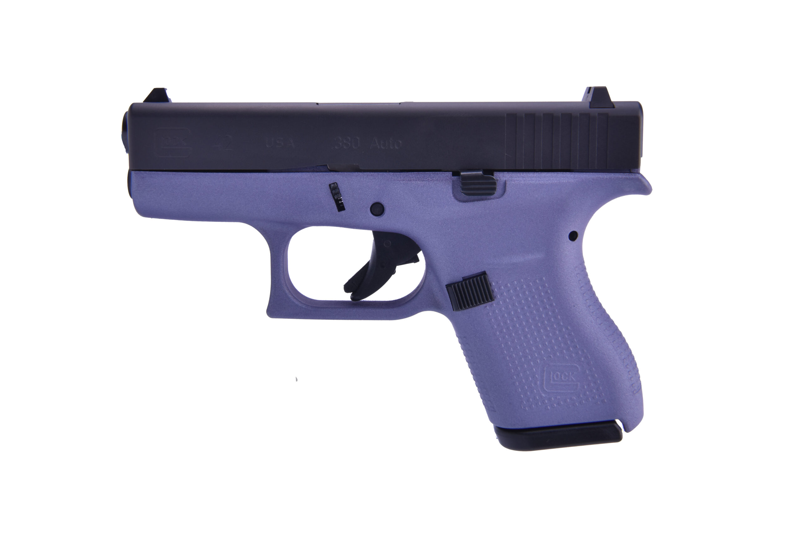The Glock G42 380ACP is the perfect concealed carry handgun for those with smaller hands. Featuring a 3.25" barrel, this pistol offers superior accuracy and reliability at an affordable price. The 6+1 capacity allows you to have enough firepower to protect yourself in any situation. This firearm comes with a black and crushed orchid finish that gives it a unique look and feel. It also has a nitride treated barrel for added durability and corrosion resistance. The GLOCK G42 is designed for comfort, featuring an ergonomic grip that fits snugly in your hand and a smooth trigger pull for easy operation. This semi-automatic pistol is lightweight yet sturdy, making it easy to carry around with you. It also features an accessory rail so you can attach lights, lasers, and other accessories if desired.