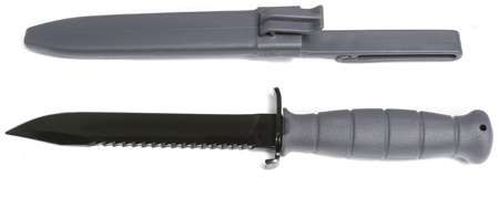 This saw back survival knife is an ideal addition to any tool kit, field pack or belt. It features a tough 6.5" carbon steel clip point blade and molded polymer hilt, tough enough to break windows or cut through the toughest tree limb, yet perfectly balanced for appropriate conditions. The one-piece polymer sheath is ideal for keeping the 3/16 inch blade protected. The set includes an integral retention system to keep your Glock knife secure during times of extreme activity.