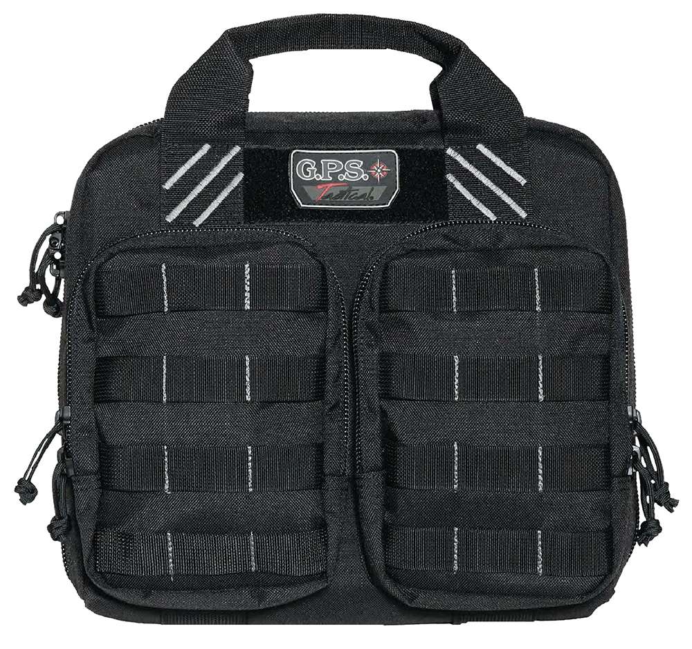 The Tactical Double +2 Pistol Case has a double quilted inside storage area measuring 11"H x 12.5"W, for double handgun storage on each side. It also has twin front ammo pockets with triple-stitched MOLLE webbing with a YKK locking zipper on the main compartment for legal transport. Visual ID storage areas have pockets for magazines and velour-lining to protect glasses and ear pieces. The Tactical Double +2 Pistol Case has a hook and loop GPS Tactical logo patch, removable to personalize with a name or club placard. The GPS Tactical line of gear is made of 1000 Denier heavy-duty material with DuPont Teflon coating for grime resistance and is sewn with mildew- and rot-resistant nylon-based thread using Box and Bar tack reinforced stitching in all critical areas.