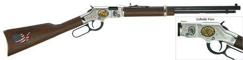 In recognition of their vital role in keeping our nation powered, Henry is pleased to present the American Coal Miner 2nd Tribute Edition. Fueled by the Industrial Revolution, coal mining began in Pennsylvania in the mid-1700s. Although it has become safer and easier throughout the years its still full of challenges. From energy policy to environmental concerns, modern mining personnel must be highly skilled in computers, complex instruments, and equipment. Its because of these advances that coal went on to become a driving force in the worlds economy leading some to consider it the safest and most economical fuel source of all time. The original art on this rifle is hand-cut by engraver Rob Bunting with foliage inspired scrolls on the nickel plated receiver cover. An outline of the United States of America and the unwavering declaration "AMERICA IS COAL COUNTRY" is laser etched and hand painted onto the American walnut stock. The left side salutes the heritage of the underground miner with a drawing of the iconic pick in action etched and plated in 24K gold. The front left panel shows the working hands of a miner holding the results of his labor.