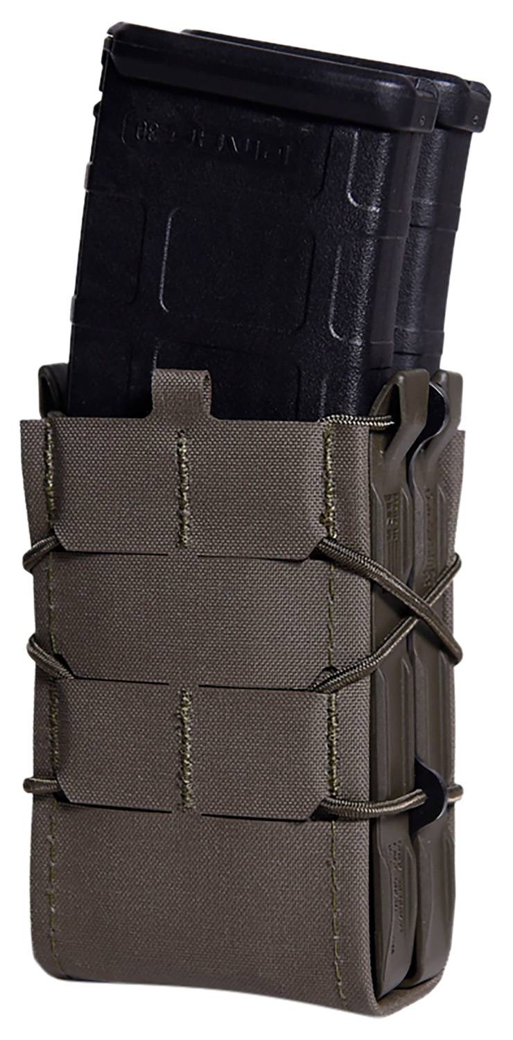 The Generation 2 X2R TACO is sleeker, lighter, and more versatile than the original. Like the Original X2R TACO, the Gen 2 X2R TACO holds 2 of virtually any rifle magazine. Contoured molded sides allow easy insertion of magazines. Integrated shock cord provides adjustable retention. Constructed from laser-cut nylon laminate wrapped over a woven thermaoplastic core, Gen 2 TACOs weigh almost 20% less than the Originals. 1/2 inch interval MOLLE on the back of the TACO allows for both MOLLE and belt mounting options. With the addition of an HSG OTR Cover accessory, any Gen 2 TACO can be set up covered or open-top
