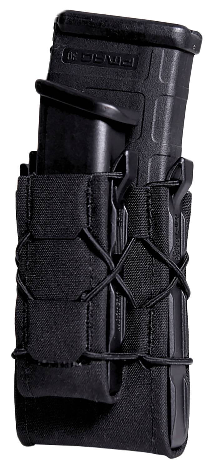 The Generation 2 Double Decker TACO is sleeker, lighter, and more versatile than the original. Like the Original Double Decker TACO, the Gen 2 Double Decker TACO holds 1 rifle magazine and 1 pistol magazine, or similarly sized items. Contoured molded sides allow easy insertion of magazines. Integrated shock cord provides adjustable retention. Constructed from laser-cut nylon laminate wrapped over a woven thermoplastic core, Gen 2 TACOs weigh almost 20% less than the Originals. 1/2-inch interval MOLLE on the back of the TACO allows for both MOLLE and belt mounting options.