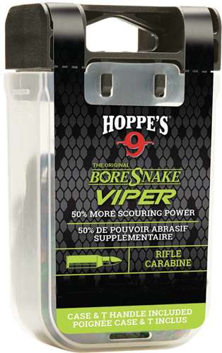The original fastest bore cleaner on the planet has a new home. Hoppe's BoreSnake Den is a compact carrying case with a built in handle for easy storage between firearm cleanings. It conveniently fits in a range bag or backpack to protect your Boresnake brushes during transport. The lid of the Snake Den doubles as convenient pull handle that snaps into the clear case for storage. A one pass solution, BoreSnake uses an integrated bronze brush to scrub out carbon fouling, while the tail clears the barrel of loose debris with a surface area 160x larger than a standard patch.