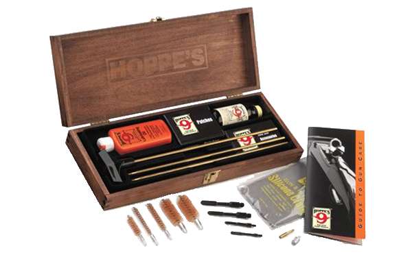 Hoppe's Presentation Wooden Box Kit contains Hoppe's No.9 solvent, lubricating oil, patches, three piece brass rod, four slotted ends and five phosphor bronze brushes to fit .22 and .30 caliber rifles, .38 caliber handguns, and 12 and 20 gauge shotguns. The kit also contains a rifle, shotgun adapter, handgun adapter, silicone cleaning cloth and Hoppe's Guide to Gun Care booklet.