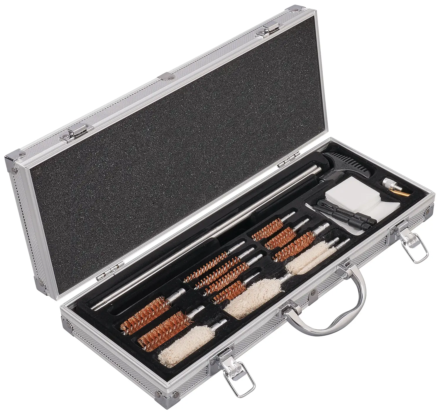The Universal gun cleaning accessory kit includes: 3-piece universal brass cleaning rod; 10 phosphor bronze brushes to fit .22, .270/7mm, .30, .357/9mm, .40/10mm and .44/.45 calibers, along with 12 ga., 20 ga. and .410 bore; 5 swabs for 12 ga. and 20 ga., plus .35/.38, .22/270, .40/45 calibers; 4 slotted ends to fit ends to fit most calibers; 9 jags for 17/20, 22/243/6mm, 25-6.5mm, 30-8mm, 375-40, 416 to 44, 338 to 9mm; 3 utility brushes nylon, bronze, stainless steel; 2 round receiver brushes for 45 cal and 12 gauge shotgun and pistol adaptable.