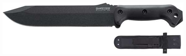 A synthesis of Becker's trademark ergonomic handle design and a traditionally profiled American Bowie style blade, the Combat Bowie has proven to perform well during extended periods of use with less user fatigue than most other knives in its class. It is a useful performer in a variety of combat and fieldcraft chores. This rugged knife has a 9.25" clip point Bowie blade is made from 1095 cro-van steel with a flat ground 20-degree edge angle. It has a 14.75" overall length; includes heavy duty polyester belt sheath with leg tie down holes.