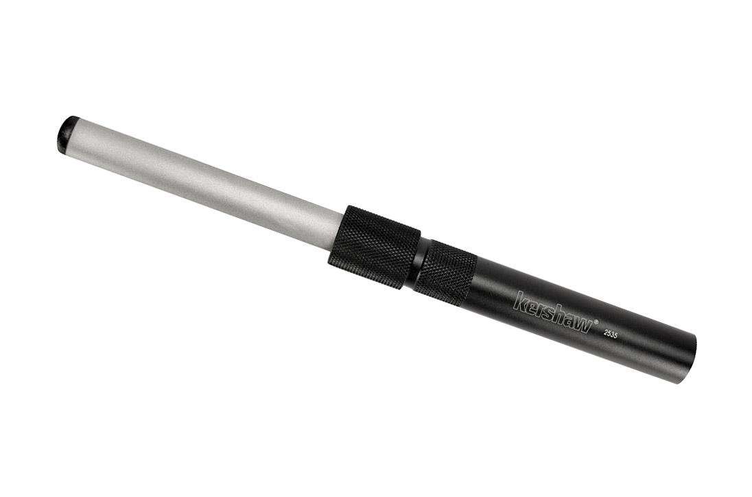 The Ultra-Tek Blade Sharpener is the convenient way to keep your knife sharp. The Ultra-Tek is a compact sharpening steel that lets you quickly and easily touch up the edge on your Kershaw anywhere, anytime. The Ultra-Tek handle is made of 6061-T6 anodized aircraft aluminum. Stored inside the handle is a 600-grit, diamond-coated oval shaft. This is the perfect grit for restoring an edge that is in generally decent shape but is just dull. Simply unscrew the shaft from the handle interior, turn it around, and screw it on to the other end of the handle. The Ultra-Tek requires no water or oil. It's lightweight and easy to use.