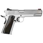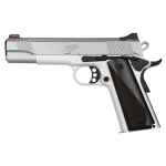 The STAINLESS LW is a limited time special offering 1911, with white dot rear sight and red fiber optic front sights, weight reducing aluminum frame, contrasting black small parts and sharp looking gray laminate grips with checkered gripping area for positive hold round out this unique package.