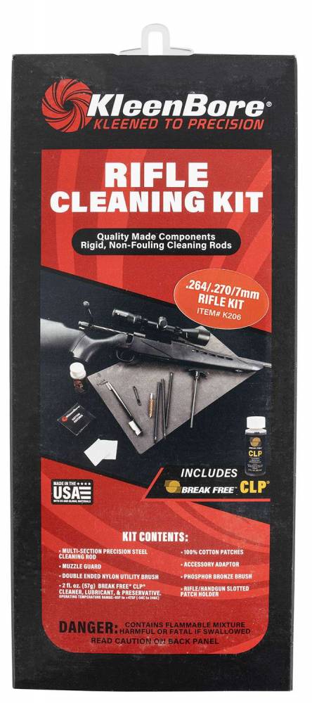 Kleen-Bore Rifle Celaning Kit features a four section, 30" steel rod with swivel handle and plastic muzzle guard. It includes accessory adapters, double ended nylon bristle gun brush, phosphor bronze bore brush, slotted patch holder, 2 oz. formula 3 Gun conditioner, 100 percent cotton cleaning patches, and silicone gun and reel cloth.