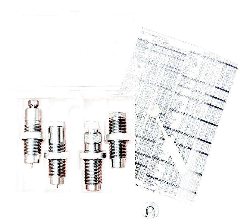 Lee's Ultimate Rifle 4-Die Set for maximum versatility. The set features a full length-resizing die to return brass to factory new dimensions, perfect for reloading brass fired in other guns. The Collet Necksizing die is used on your fire formed brass giving you best possible accuracy. No case lube required when using the Collet Necksizing die and cases last almost forever. The Easy Adjust Dead Length Bullet seating die foolproofs the bullet seating adjustment and assures perfect seating depth every time. The Factory Crimp die provides a secure crimp on bullets with or without a crimp groove. The set is complete, with shell holder, powder measure and Lee load data featuring all common brands of powder.