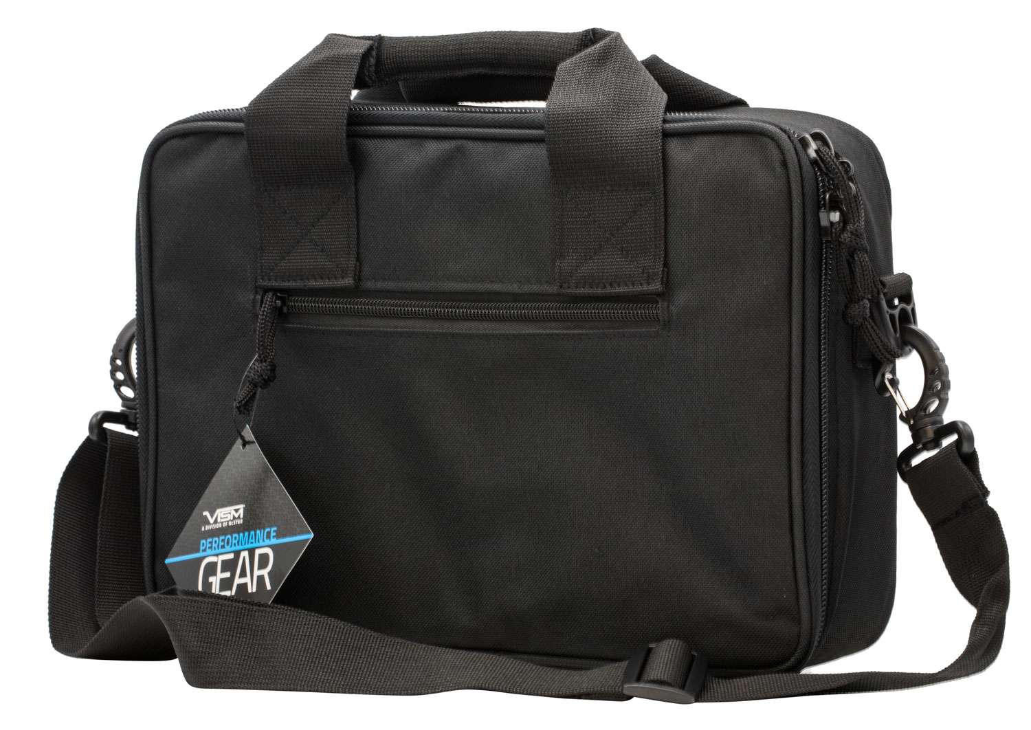 The Double Pistol Range Bags main pistol compartment can fit two standard full framed semi-auto pistols. The compartment floor is lined with loop fasteners and comes with four hook & loop straps to secure the pistols in place. There are two large flaps that close over the pistols to help secure them in place and to protect them from being scratched. The 9" long magazine pouches run nearly the full width of the bag with hook & loop flaps on both ends. This allows you to use sub-compact, double stack standard capacity magazines, and even 30+ extended magazines. The mag pouches can hold up to 10 standard capacity double stack magazines. There are also extra loop fasteners on the mag pouches for name tape or moral patches. Elastic loops for holding additional mags, shooting glasses, etc. Two slot pockets to hold a pen/marker or tools. Large heavy duty zippers on the main compartment with lockable metal zipper pulls (padlock not included). Heavy Duty padded carry handles and an adjustable shoulder strap with quick connects are included. There is also an external zippered compartment to hold paperwork, your car keys, etc. On the back side there is a 5" X 3" loop fastener patch to attach a name tape or moral patches.