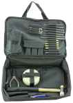 This tool kit includes a mallet, screw driver handle, needle nose plier, triangle mill file, gunsmith bench block, jeweler's screw driver, 8 piece steel punch set, 5 piece brass punch set, piece polymer punch set, 1/4" 30 piece screw bit set, phillips, hex, torx, 1/4" hex bit to a 1/4" socket adapter, a square, and a pair of clear lens safety glasses.