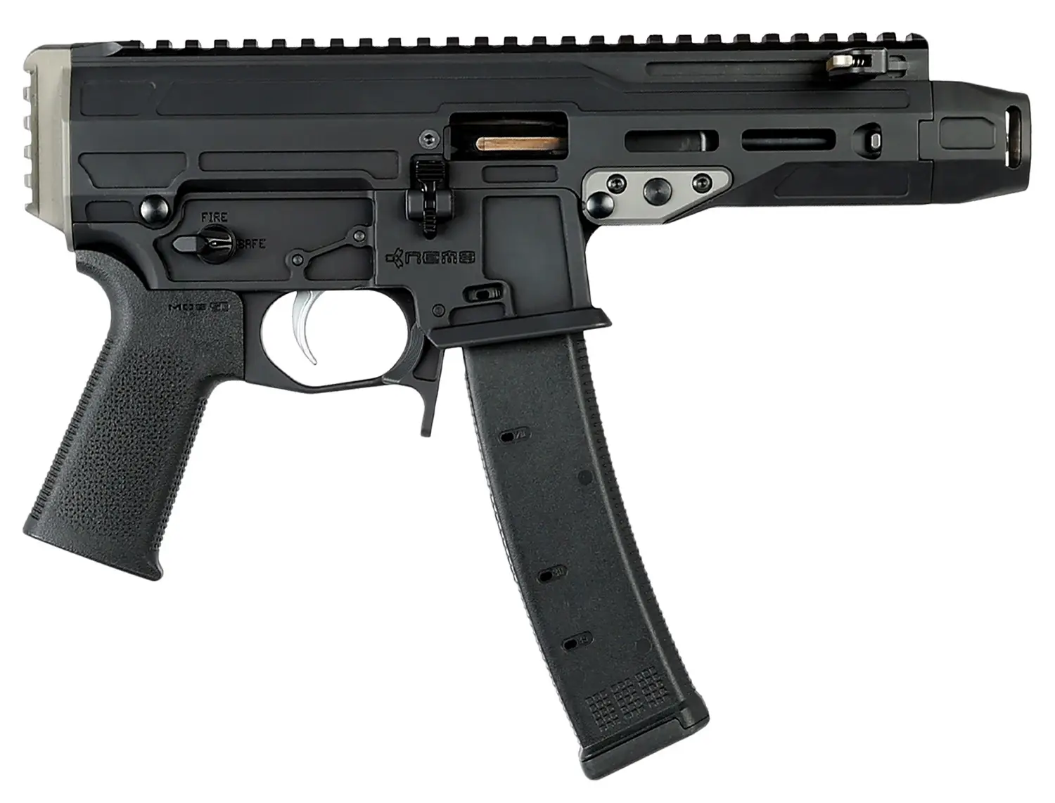 The Mongoose offers customers a lightweight, low-recoil pistol-caliber carbine for competition, home defense and plinking. Low recoiling mass is achieved by using a short-recoil operating system with redundant locking lugs rather than the conventional straight blowback system. A front cap compensator not only reduces muzzle rise but also ensures reliable firing when front barrier contact is encountered. Ambidextrous controls include mag release, safety selector and bolt catch/release. The non-reciprocating charging handle can be customized to either left or right-hand side. Takedown and field stripping is easy and quick. Magpul 35rd magazines allow for reliable feeding up the feed ramp and into the tilted barrels chamber.