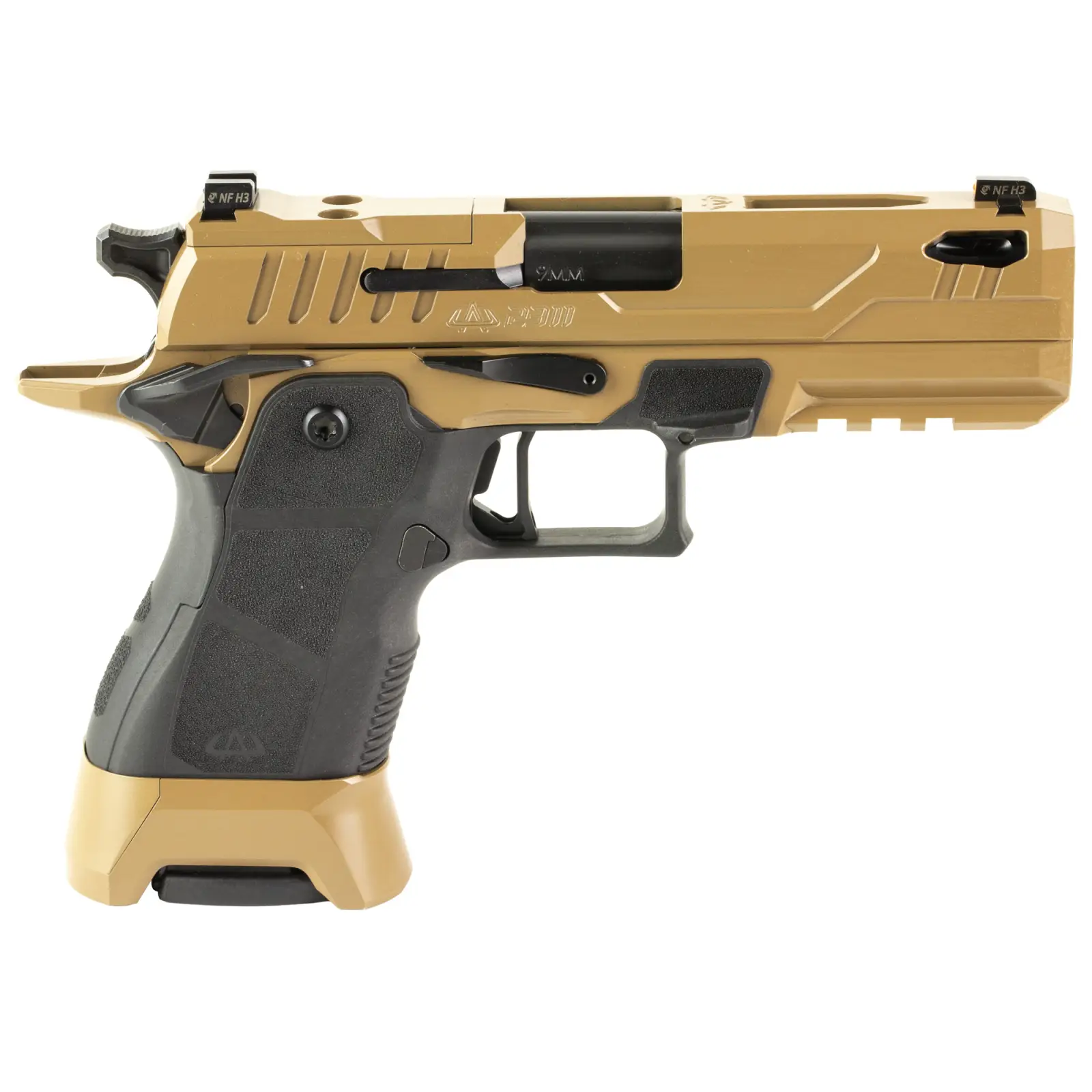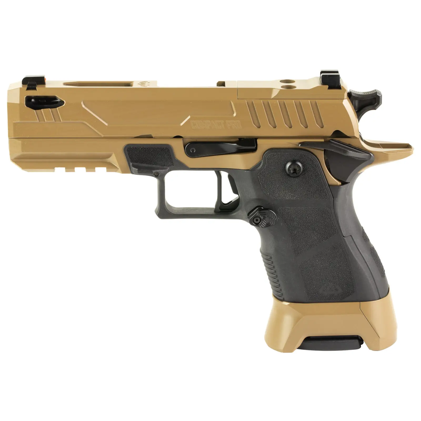 OA Defense, 2311 Compact Pro Plus, Single Action, Semi-automatic, Metal Frame Pistol, Compact, 9MM, 4.25" Ported Barrel, Matte Finish, High Desert, Black Grip, Extended Magazine Release, Enhanced Trigger, Tritium Night Sights, Optics Ready, 17 Rounds, 5 Magazines, Includes 3 Optic Mounts for RMR, Delta Point Pro, and RMSc, Full Size Magwell Installed, Custom OA Defense Range Bag
