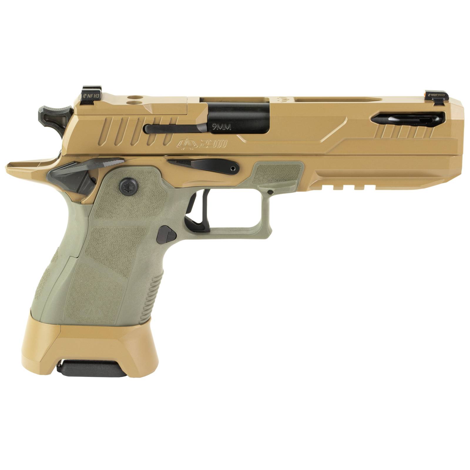OA Defense, 2311 Pro, Single Action, Semi-automatic, Metal Frame Pistol, Full Size, 9MM, 5" Ported Barrel, Matte Finish, Desert Tan, Sage Grip, Extended Magazine Release, Enhanced Trigger, Tritium Night Sights, Optics Ready, 21 Rounds, 5 Magpul AMAG Magazines, Includes (4) Optic Mount Plate, Custom Pistol Case