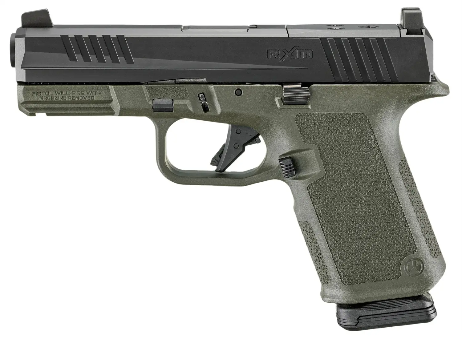 The Ruger RXM features an interchangeable Magpul enhanced grip; most major components are designed for Gen3 compatibility with off the shelf parts, holsters and accessories; Co-witness-height steel sights feature a tritium night front sight; low-profile, flared magazine well; magazine release scalloped for easy access; universal accessory rail for use with a variety of lights and lasers; extended magazine release and raised slide stop. Slide allows for direct optic mounting of RMR, DPP and RMSc pattern optics. Includes two Magpul PMAG 15rd GL9 magazines and a co-branded plastic carry case.