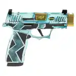 Sig Sauer, P365X Komodo Anime, Striker Fired, Semi-automatic, 9MM, 3.1" Zaffiri Threadless Compensated Barrel in High Polish Gold, Optic Ready, Komodo Aluminum Grip Module, Cerakote Finish, Dayglow Blue, 17 Rounds, 2 Magazines