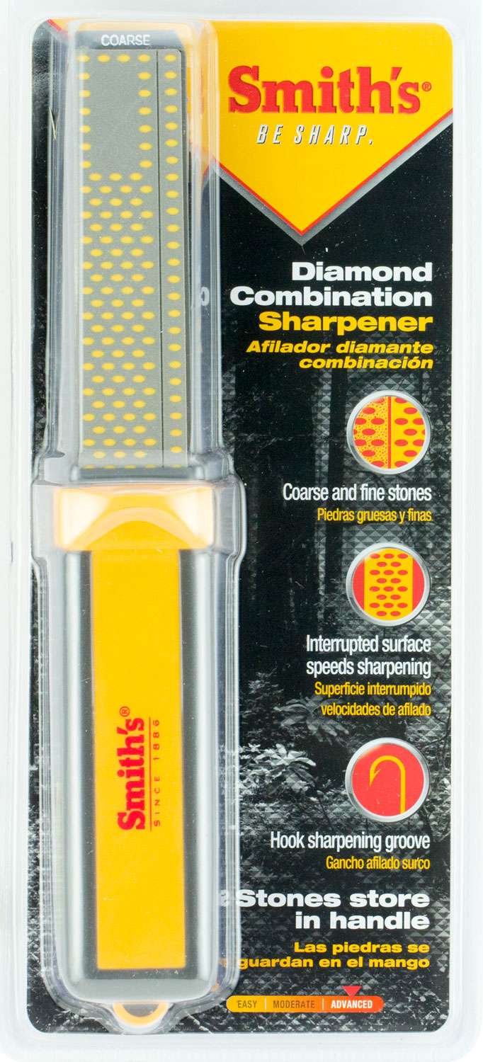 Smith's 4" Diamond Combination Bench Stone features coarse and fine grit sharpening surfaces. The surface contains multiple layers of micron-sized moncrystalline diamonds and a unique sharpening surface with an overlapping oval hole design. Each stone has a "micro-tool sharpening pad" and a sharpening groove for fish hooks or pointed tools. The soft grip rubber handle is designed to make sharpening safe and easy, and when you are finished sharpening, you can store your stones in the handle for safekeeping.