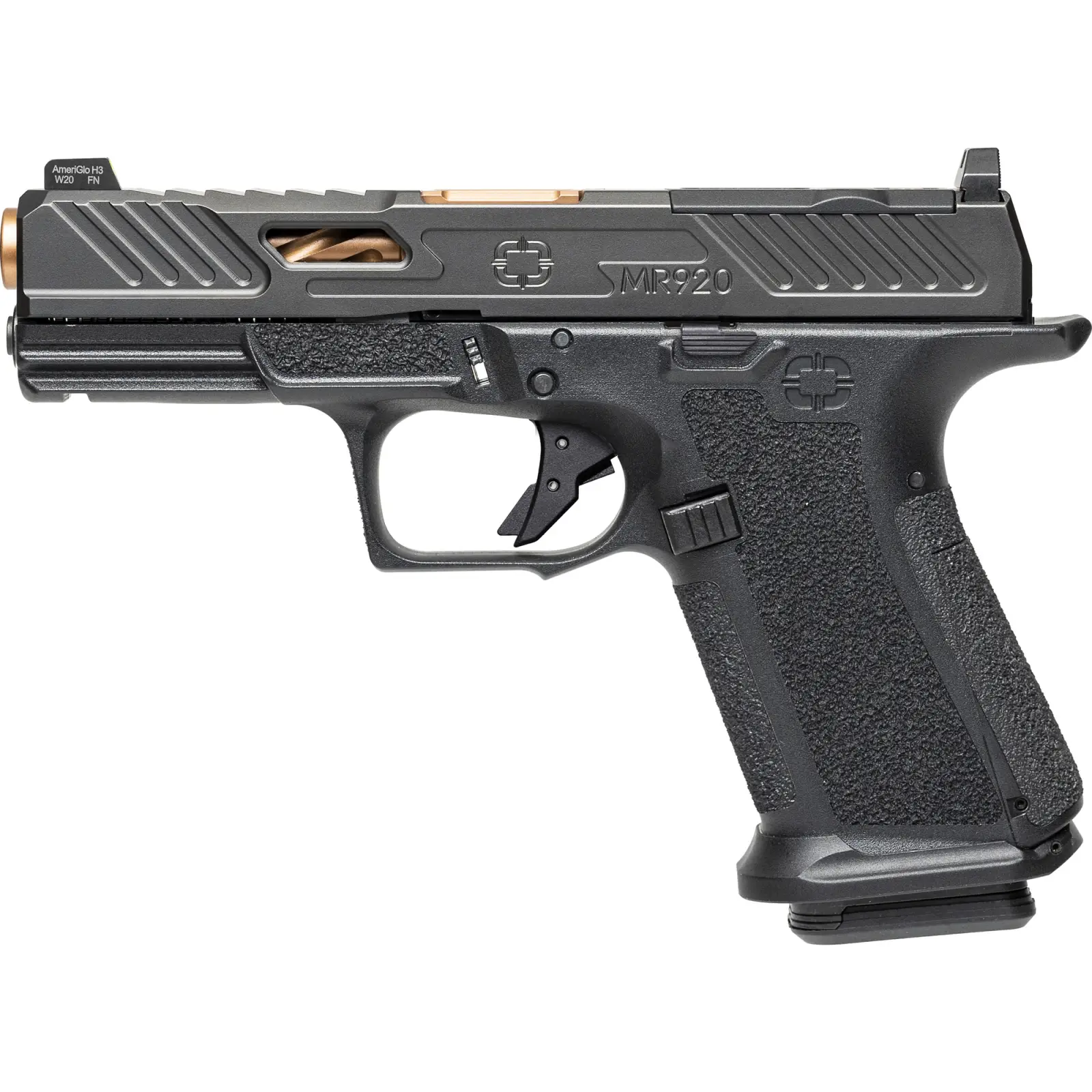 The MR920 is a feature-packed, compact-sized pistol that is designed to work with existing G19 holsters, magazines, and gear. The match-grade barrel is conventionally rifled and spiral-fluted to improve evacuation of debris. MR920s are also available with threaded barrels, for those departments that allow the use of muzzle devices. The drop-safe, flat-faced aluminum trigger has a 4.5-5.0 lbs trigger pull and a crisp, tactile reset. Optic cut models allow shooters to mount the mini red dot optic of their choosing. The optic cut on the MR920 can accommodate most major brands of RDS optics directly mounted to the slide, without intervening plates or adapters. The MR920 Elite model features directional slide serrations in front, rear and topside locations, as well as a weight-optimizing window cut on the side. The slide top is milled with a multi-footprint optic cut to accommodate most optics.