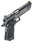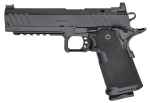 Featuring a 4.4" bull barrel with a DLC black finish, this pistol offers two 17-round and one 20-round magazine capacity and a 4 lb trigger with ambi safety levers for maximum comfort and accuracy. The front fiber optic and tactical Dawson universal optic system provide exceptional targeting, and the Dawson 4.4 adaptive toolless recoil system ensures a smooth shooting experience.