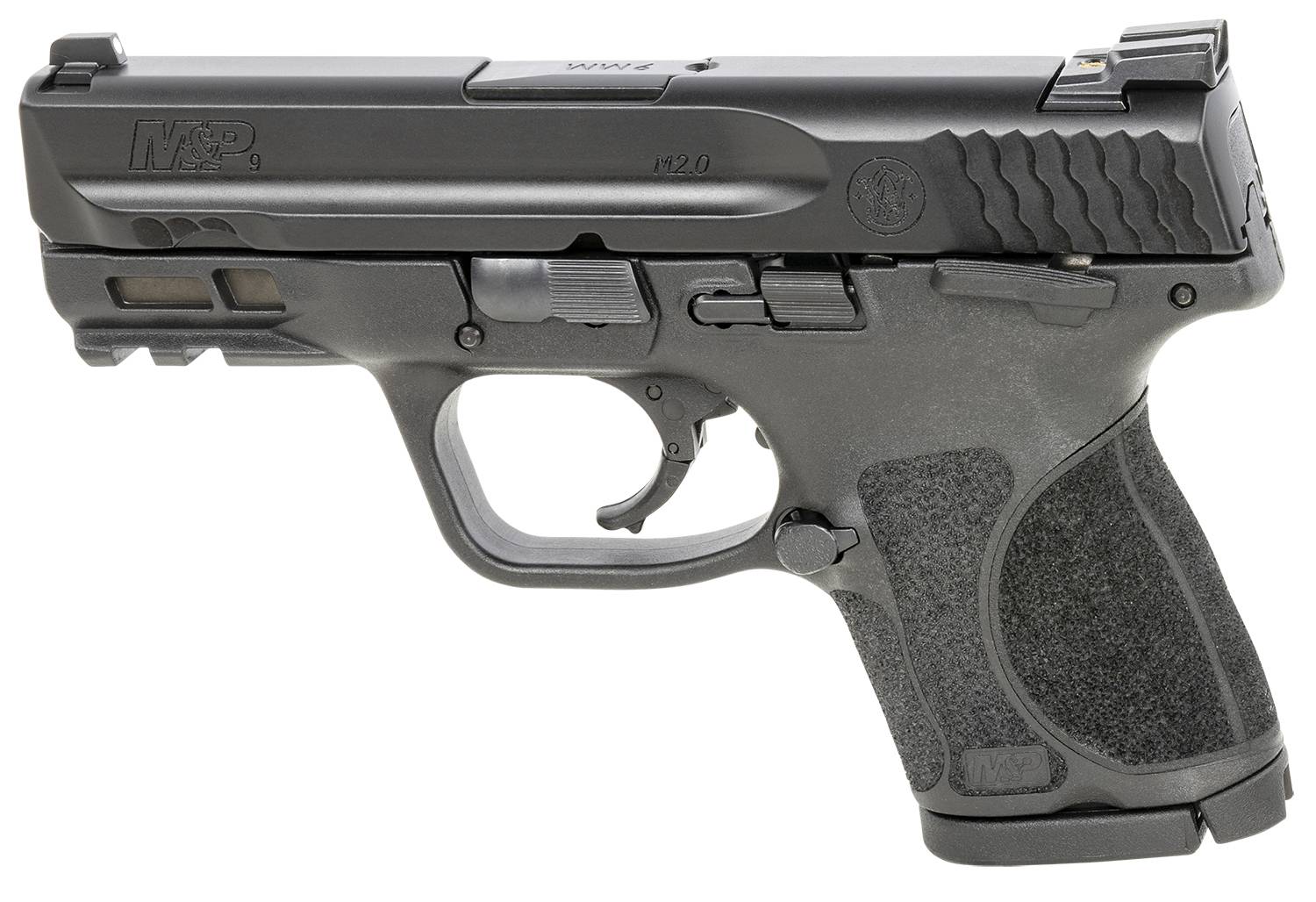 S&W M&P M2.0 with its patented take-down lever and sear deactivation systems allows for disassembly without pulling the trigger. The pistol features a Picatinny-style rail; forward slide serrations; low barrel bore axis; optimal 18-degree grip angle for natural point of aim; enhanced grip texture allows the user to manage recoil and keep a firm grip; M&P M2.0 trigger with lighter trigger pull; tactile and audible trigger reset; extended rigid embedded stainless steel chassis to reduce flex and torque when firing and an Armornite durable corrosion resistant finish. Includes range bag, four interchangeable palmswell grip inserts for optimal hand fit and trigger reach and two magazines.