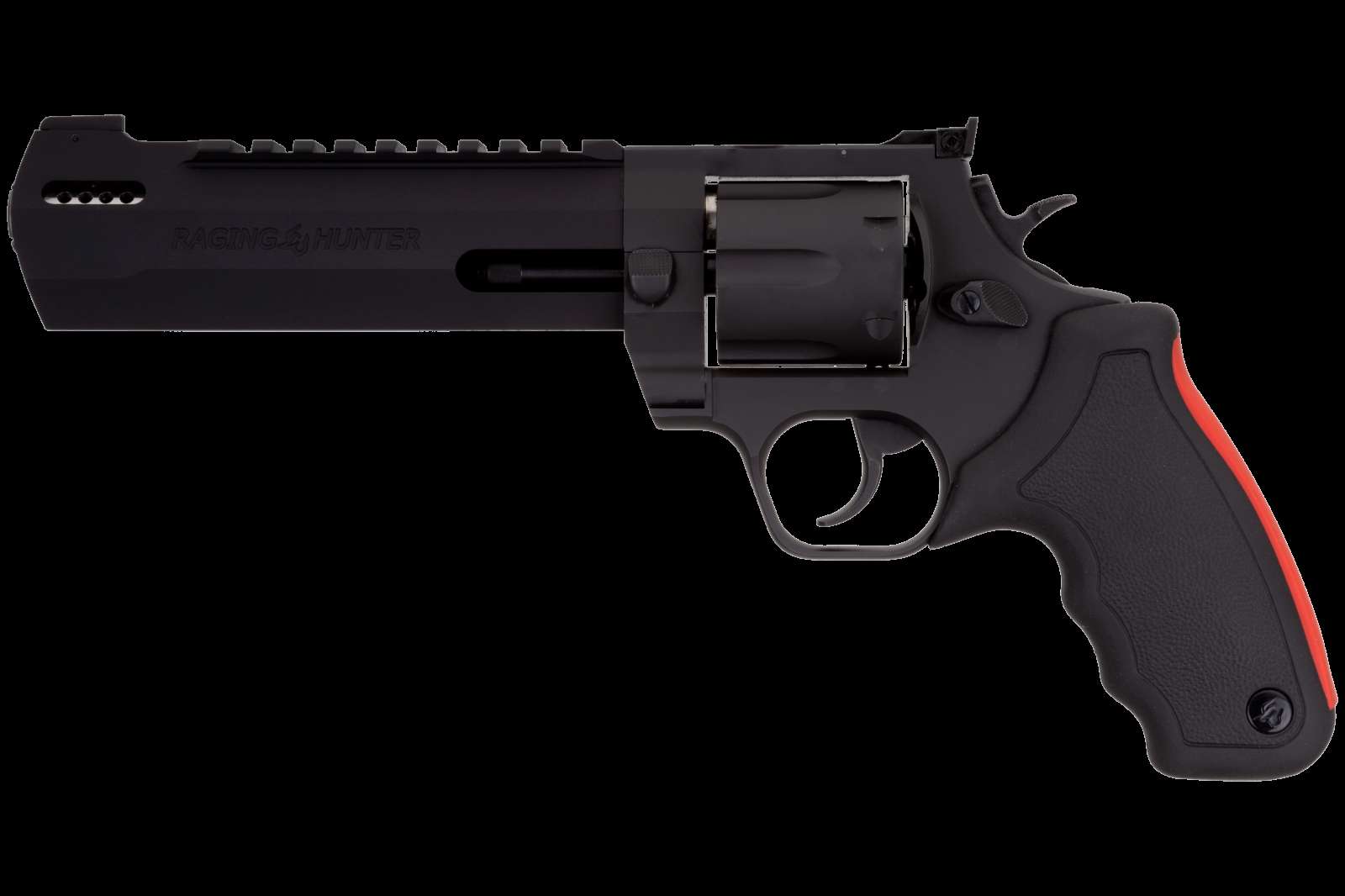 The Taurus Raging Hunter is a 44 Magnum, 6-shot revolver. Its striking blue finish is enough to grab the attention of any big-bore aficionado, but the optics-ready Picatinny rail and angular barrel design will seal the deal. The unique barrel system incorporates a steel sleeve that is inserted into an aluminum housing that cuts down on the overall weight, making this a well-balanced hunting sidearm. The exclusive cushioned insert grips on the Raging Series large frame revolvers makes shooting them comfortable and controllable. Also aiding in recoil management is the unique placement of the factory-tuned porting and gas expansion chamber that is designed to disperse gases directionally-reducing muzzle lift and delivering quicker target acquisition. This built-to-last revolver is a fun and effective alternative for short to medium range hunting scenarios.