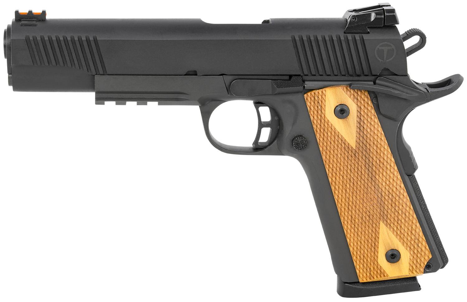 The Full Size Tactical model features a combat hammer, skeletonized trigger, ambidextrous safety, and extended beaver tail to add to the safety and comfort of this pistol. Wide angled serrations on front and back of the slide for control when operating the slide mechanism and parkerized finish with checkered walnut grips complete the tactical look and function of this pistol. The frame features a short picatinny rail for the option of mounting a light, or other accessories. It includes a Novak style rear sight and a green fiber optic front sight.