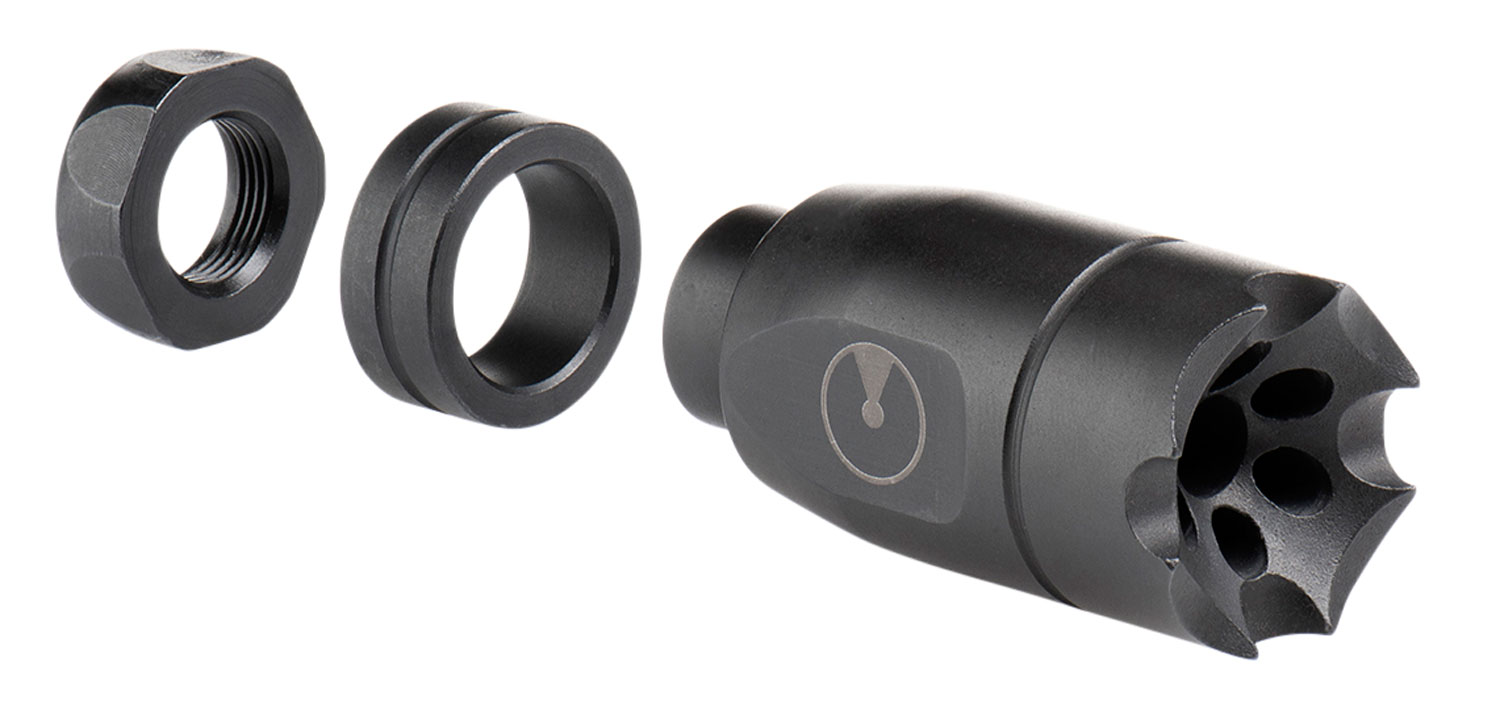 Made in the USA, the Athena is Ultradyne's linear compensator. It gives a cleaner appearance for a sleek look compared to traditional brakes and is the most cost-effective way to upgrade a rifle to the Dynamount Sighting System. Muzzle rise has been optimized, with gas vented at an angle then forward. This sends a lower percent of sound and gasses back towards the shooter, optimizing sonic performance over recoil. A timing nut is included for easy installation.